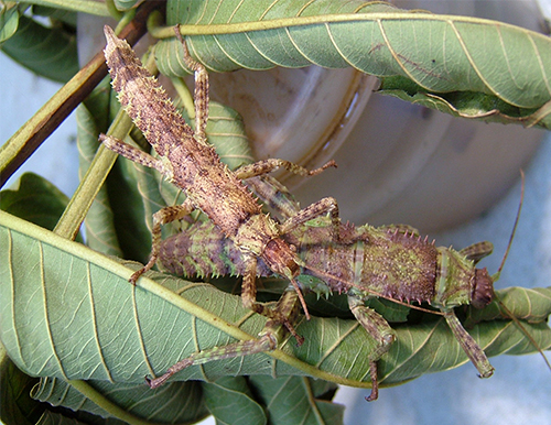 有綠與褐色混而為迷彩色,若蟲喜歡在樹上,若蟲表面粗造無光亮感,而成蟲則呈現具有光亮的黑褐色表面,成蟲則喜歡在地面活動!雄蟲約3~4個月成蟲 ,雄蟲後腿有巨棘,故稱巨棘竹節蟲!雌蟲約4~4.5個月成蟲