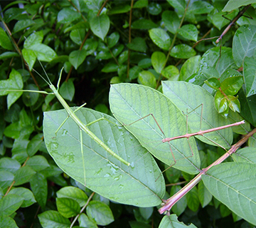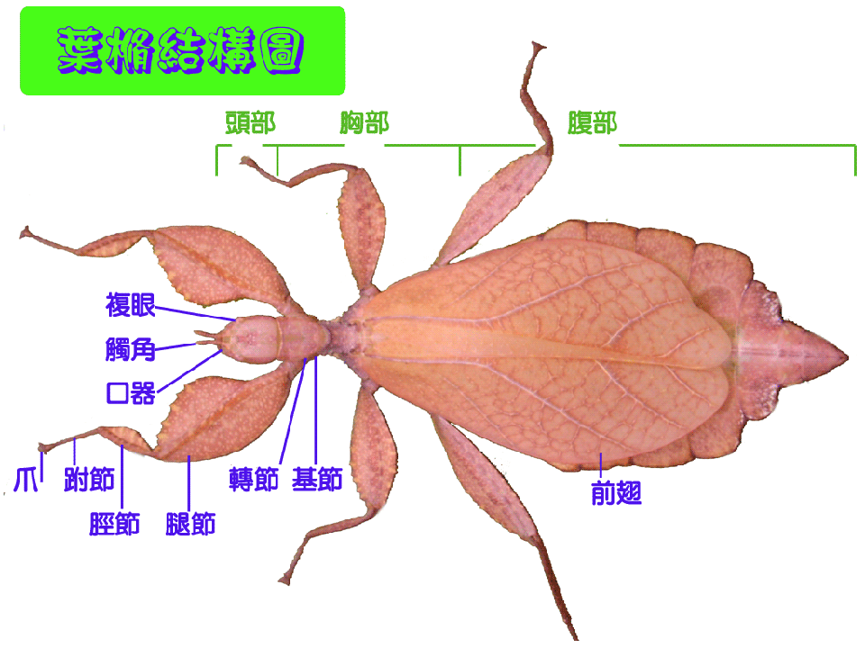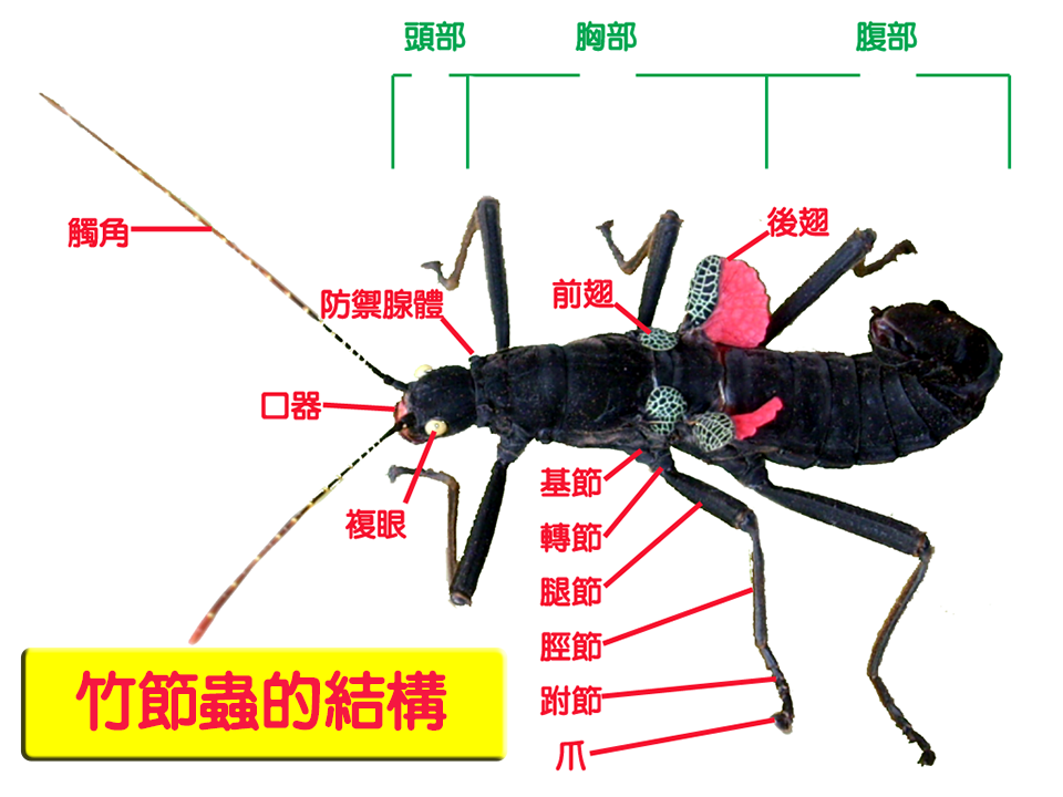 在山上坐在樹欉ㄧ旁休息,突然看到有樹枝在移動,定眼一瞧原來是隻偽裝很強的 --竹節蟲 ,就因他善於擬態與偽裝很容易就跟自然融為一體,所以竹節蟲就在您身邊您可能還感受不到牠的存在!所以 當初在拉丁學名命名時,稱 竹節蟲為 phasmida,即是 "精靈"之意 !相當符合 這蟲的特性! 竹節蟲皆為草食性的昆蟲,以善於擬態成樹枝或樹葉著稱,可以藉此躲過天敵。全世界約有2,500種。有些品種超過半公尺,是世界最長昆蟲的保持者!有非常大型的體型也有放在指頭上小型昆蟲,一般體型修長,呈圓筒形,棒狀或枝狀;少數種類扁平如葉。複眼發達,單眼通常退化。翅膀通常退化;如有翅膀,前翅通常小於後翅。 生命週期為 卵、若蟲(竹節蟲的幼體稱若蟲 ,竹節蟲因是不完全變態,而幼體形體與成蟲相若(相像),所以稱為若蟲!)、成蟲 三階段),陸棲性,植食性昆蟲。 而竹節蟲(䗛)目裡主要分二大類 :一類為棍棒狀我們稱為”竹節蟲” 西方稱”Stick insect"棍子蟲 ;另一類種類較少,呈現為葉狀,我們稱為”葉䗛” 西方則稱為” Leaf insect”葉子蟲”!